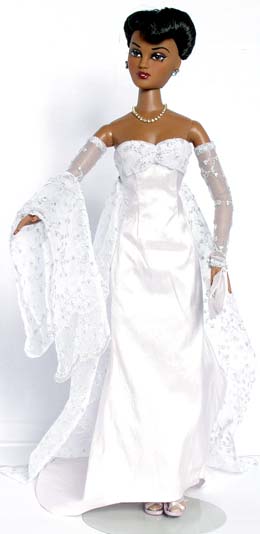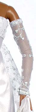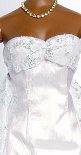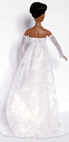 Set Four in the Evening collection is a truly beautiful creation of silk and lace. Violet is a vision of loveliness is this paler - than - pale pink silk dress. The dress has clean lines and flows down to a wider trailing hem at the back. The bust has a silver lace overlay and this same lace has been used for the long evening gloves, train and stole giving an elegant look. This dress would look very striking made up in a black... Alternatively, this design could be easily used for a modern Wedding Gown using different materials. Imagine this in ivory silk with cream lace... Don't forget you can submit your own ideas and colours! It's what Couture really means!