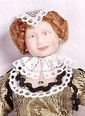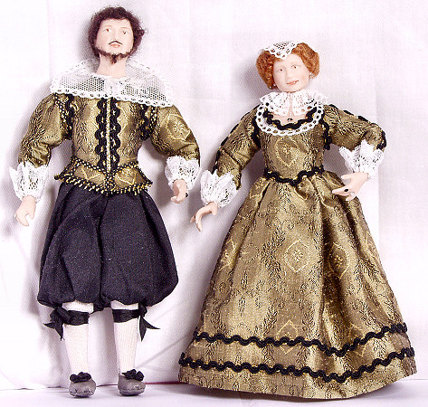 This couple are dressed in traditional costumes from the reign of James I The gentleman is dressed gold and black jacket with a large lace collar and cuffs with generous pantalons and ribbon topped stockings The lady is dressed in a gold jacquard print dress with black braid trim and lace cuffs with a lace collar and head covering.