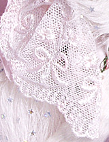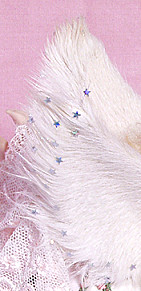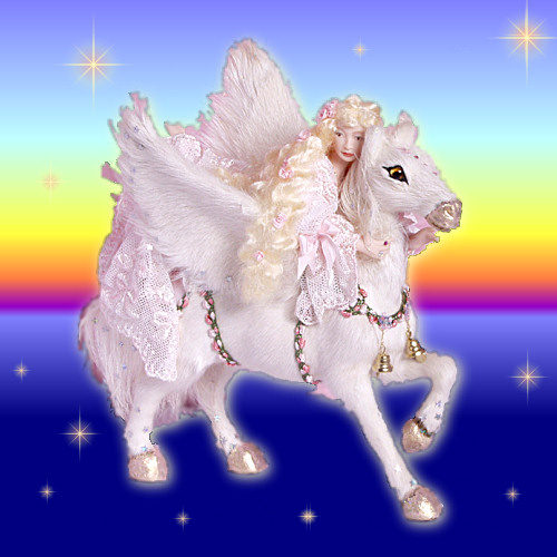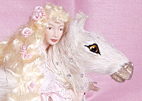 'Once Upon A Time' is part of new deluxe Collection of miniature dolls I have created with attention to authenticity, intricate detail and using only fine fabrics. ‘Once upon a time there was a beautiful princess who longed to fly to the moon. One starry night, she awoke to hear a tapping on her bedroom window. There stood a magnificent white winged horse. Before she knew it she was soaring up into the midnight sky, safe between his huge strong wings. Could this be real or was it just a wonderful dream……a simple flight of fancy?’ EA one twelfth scale miniature porcelain doll on a stunning white winged horse. The princess wears a charming negligee in ivory and pink lace over pale shell silk. She lies on her tummy with her bare feet delicately crossed behind her and her lovely long blonde hair, decorated with silk roses, tumbles down past her shoulders. (The doll is fixed to the horse) The magnificent winged horse wears a silk ‘coat’ embellished with pink and green floral braid. His hooves are painted with pink/gold pearl paint and his wings, legs and mane are studded with dozens of tiny holographic stars. On his chest hang two tiny golden bells. A truly magical