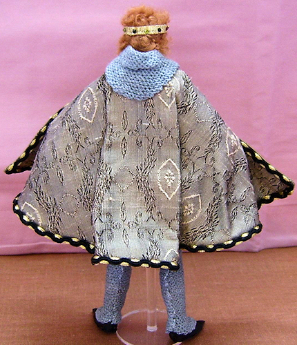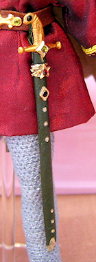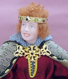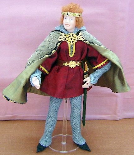 King Arthur stands approx. six inches tall and is made from fine quality bisque porcelain. Arthur is dressed in faux chain mail with a silk tunic, trimmed with golden braid and a leather belt with fancy ‘buckle’. From his belt hangs a sword with golden jewelled hilt, sheathed in a real leather scabbard. Over his tunic he wears a lined silk jacquard cloak trimmed with rich black and gold braid and fastened at the neck with a fancy jewelled clasp. On his fingers Arthur wears crystal ‘rings’. Upon his