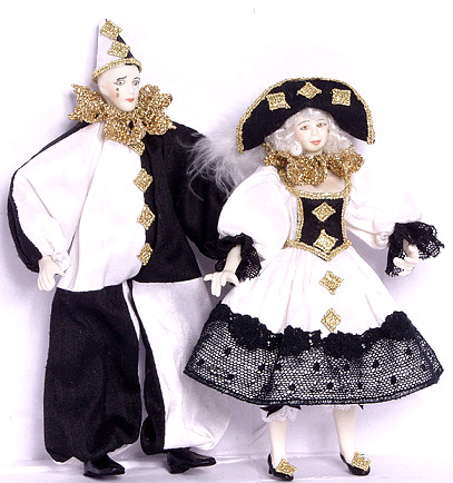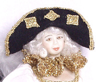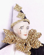 The traditional acrobatic tumbling clown wears a one piece suit and matching pointed hat in deep gold and purple silk trimmed with gold diamonds and finished with a large gold lace ruff. This clown is cast in pure white porcelain.