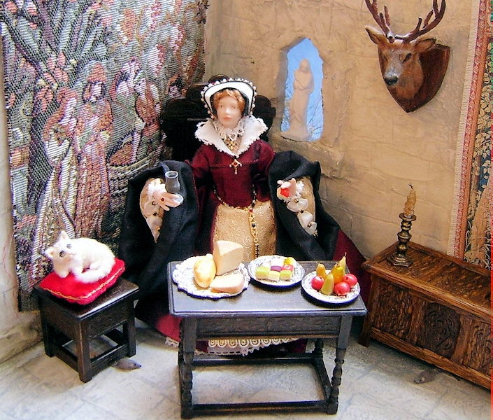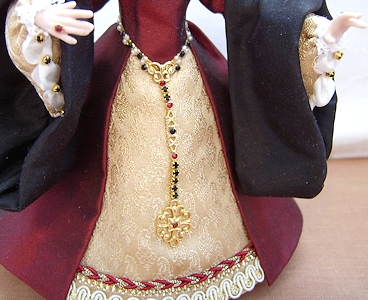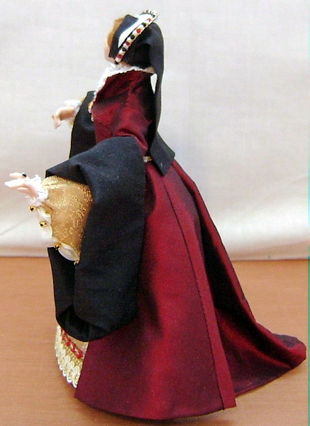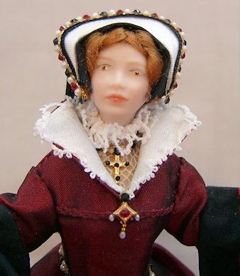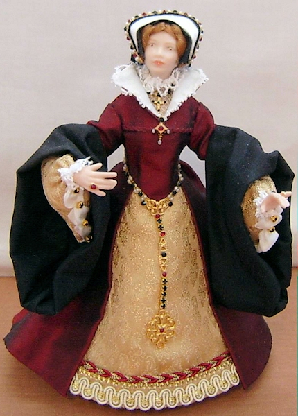 | One twelfth scale miniature porcelain doll standing approx five and a half inches tall. This hand crafted miniature porcelain character doll is Mary Tudor - "Bloody Mary" who reigned from 1553 - 1558 Mary is dressed in dark red silk dress with contrasting gold fabric front skirt and sleeves. The sleeves of her overdress are cuffed in a black fabric. A jewelled goldtone belt hangs around her waist and a pendant at her neck. Mary's headpiece of an English gable hood is typical of the period.